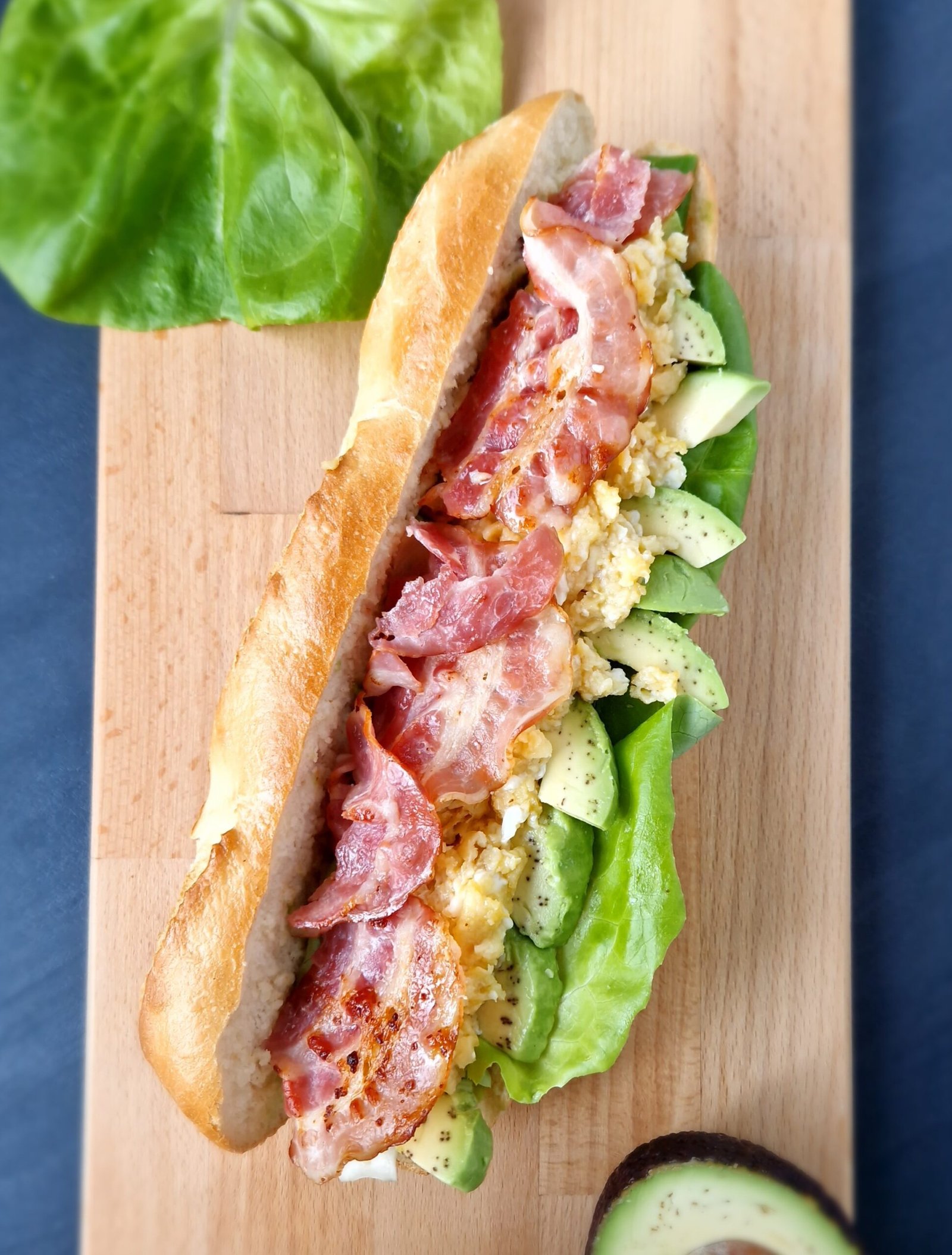 Ovenvers stokbroodje met roerei, spek, avocado en aioli.